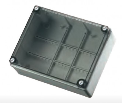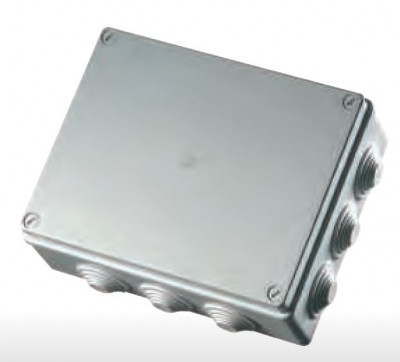 Kytkentärasia 460x380x120mm. ruuvikansi saranalla. 14 sisääntuloa. IP55. harmaa